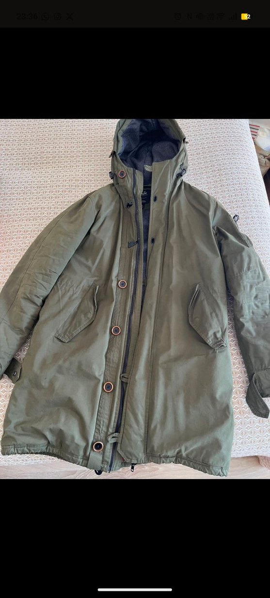 haki yeşil renkli, kapüşonlu ve düğmeli uzun erkek ceketi sayılı giyildi bedeni olmadığı için satıyorum.