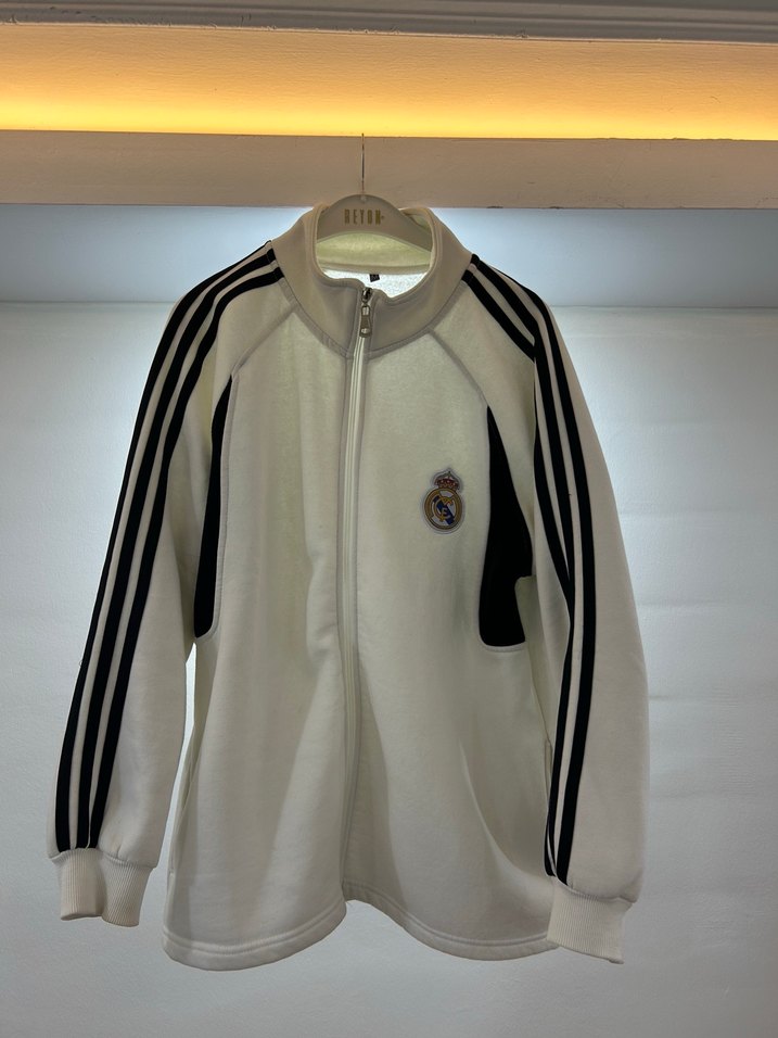 Erkekler için beyaz, uzun kollu, bol kesim ve yumuşak kumaştan fermuarlı sweatshirt. Kollarında siyah şerit detayları bulunur, spor ve rahat tarzda.