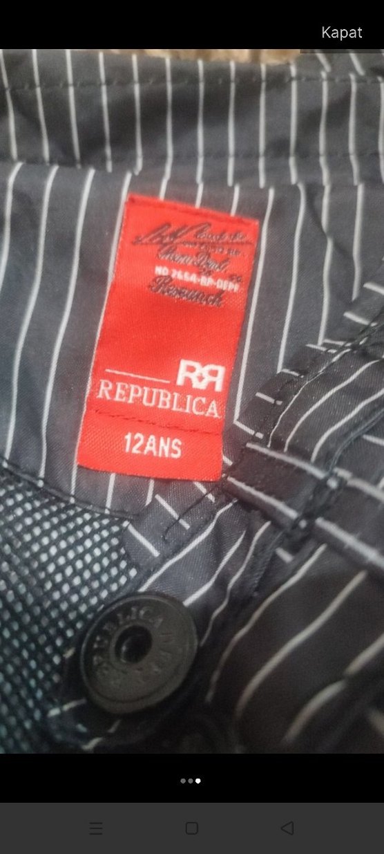 Koyu renkli sokak modası rozeti, kırmızı Republica logosu ve "12ANS" ile "RA" yazıları içerir. Vintage sokak stiline sahiptir.