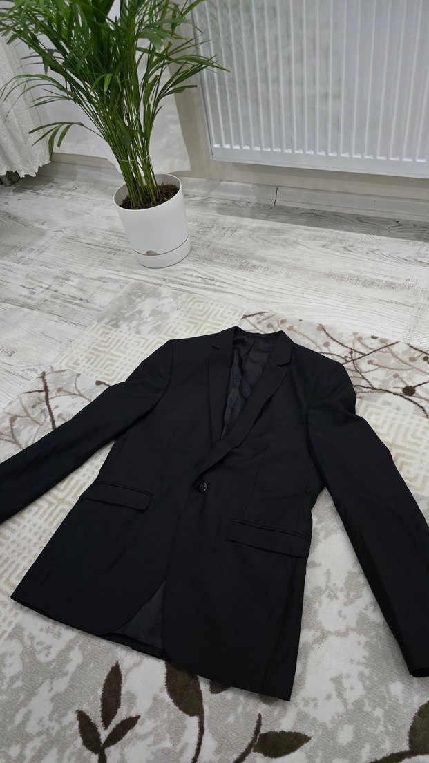 Siyah erkek ofis takım elbise ceketi, keskin yaka ve düğmeli ön detaylıdır. Uzun kollu, regular fit ve desensiz, midi boy normcore tarzındadır. ️ 50 bedendir sadece 1 kez giyildi sorunsuzdur