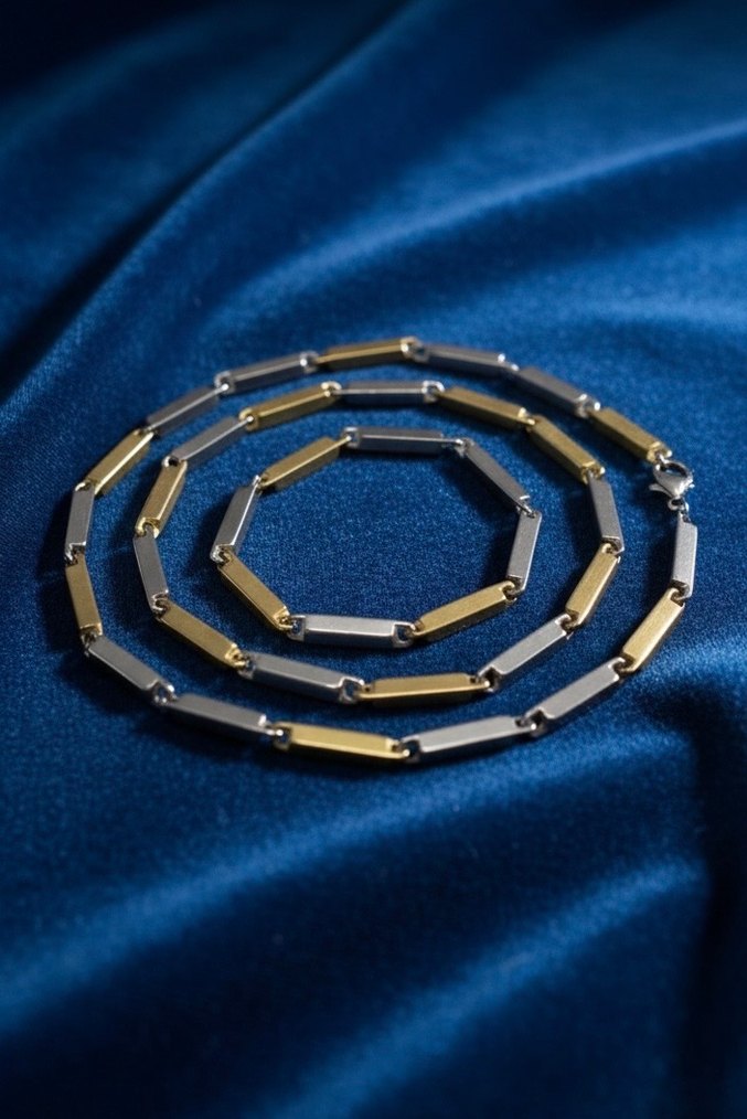 Erkekler için tasarlanmış, altın ve koyu renkli parçaların birleştiği minimalist ve çağdaş tarzda kolye. Klasik ve zarif görünüme uygundur. ✨