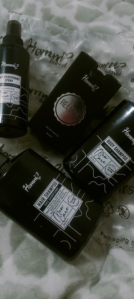Erkekler için saç şampuanı, vücut şampuanı ve ter önleyici sprey müthiş kokulu parfüm içeren siyah şık ambalajlı set.