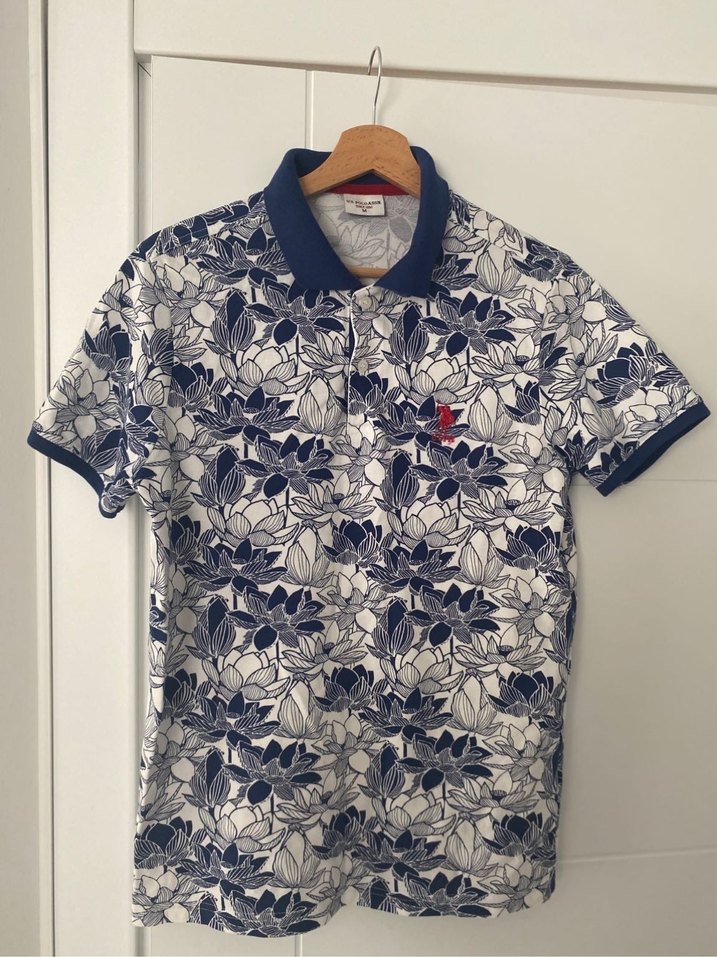 Düğmeli yakalı, kısa kollu, beyaz pamuklu kumaş üzerine mavi çiçek desenli, dar kesim erkek polo tişört. Günlük sokak stiline uygundur.