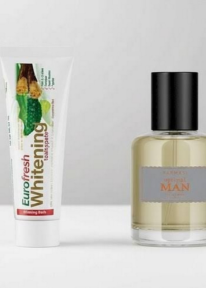 Erkekler için beyazlatıcı diş macunu ve Optimal Man parfüm içeren cilt bakım seti. Ağız bakımı ve ferah koku sağlar.