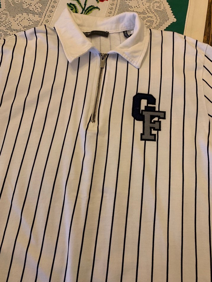 Pamuklu kumaştan, fermuarlı ve yakalı erkek polo tişört. Beyaz zemin üzerine gri çizgili, ofis için uygun kesimde ve tarzda.