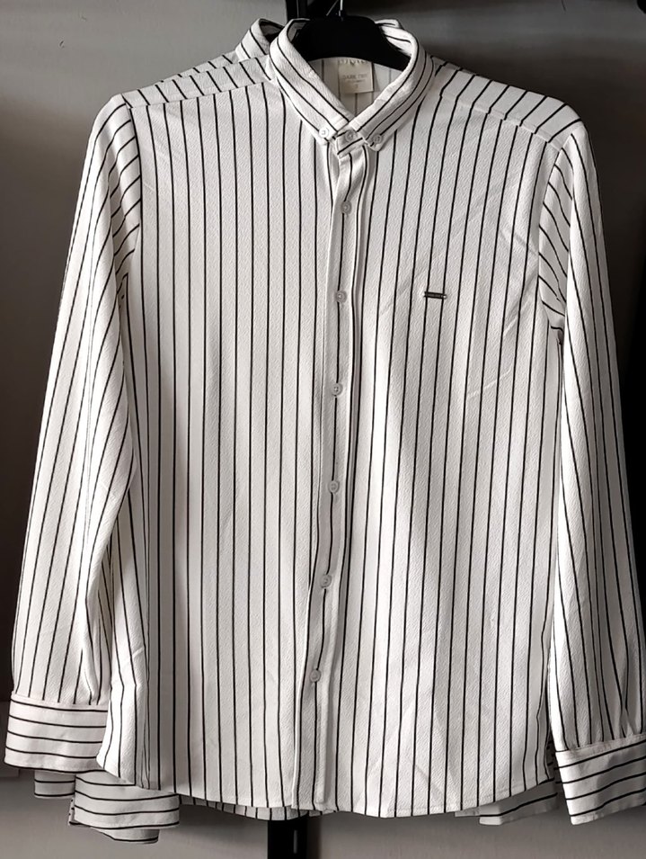 Bu erkek gömleği uzun kollu ve düğmeli ön kısmıyla, keten kumaştan yapılmıştır. Beyaz zemin üzerinde dikey gri çizgiler bulunur ve rahat bir kesime sahiptir.
