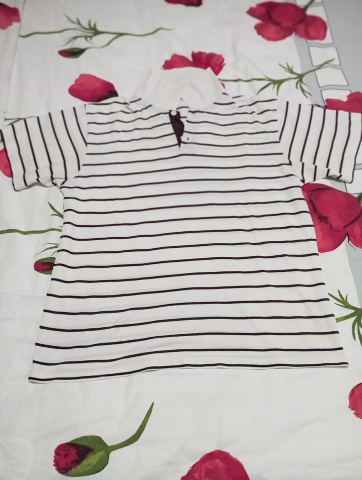 Kısa kollu, düğmeli teknelik yakalı, renkli çizgili pamuklu kumaştan yapılmış erkek tişörtü. Trendy günlük giyim için uygundur.