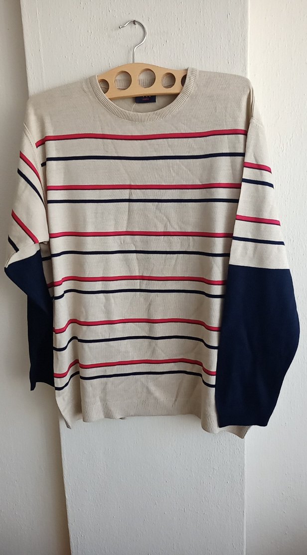 Erkekler için uzun kollu, bisiklet yaka, triko kazak. Gri, beyaz, kırmızı ve lacivert yatay çizgilerle desenlenmiş, rahat kesim, günlük sokak stili için uygun. boy 70cm iki koltuk arası 60cm