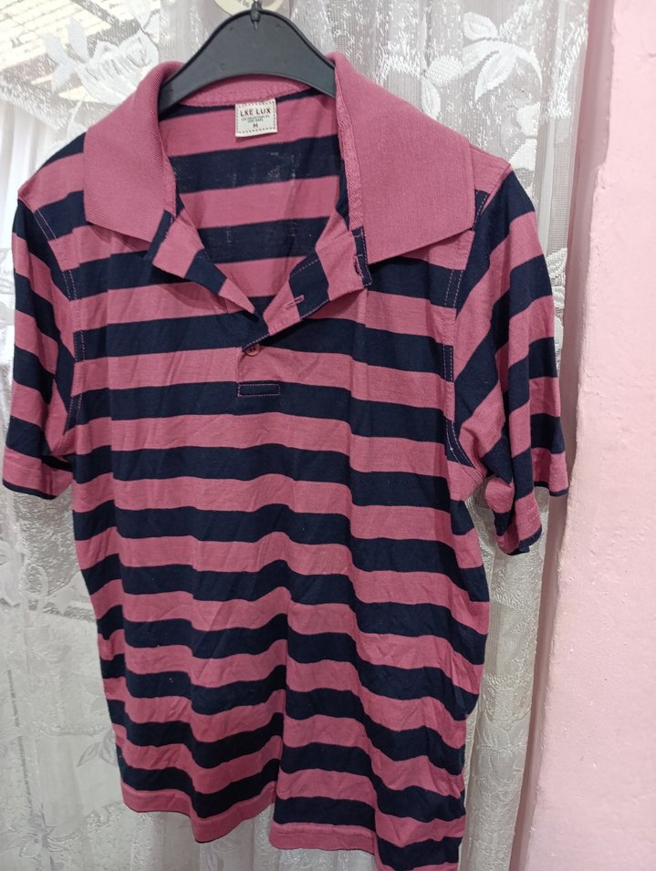 Erkekler için yakalı, kısa kollu, bol kesim polo tişört. Pastel pembe ve lacivert çizgili, düğmeli detaylı, günlük sokak giyimine uygun. Boy 66.ikikol arası 53 çok açık bordo siyah