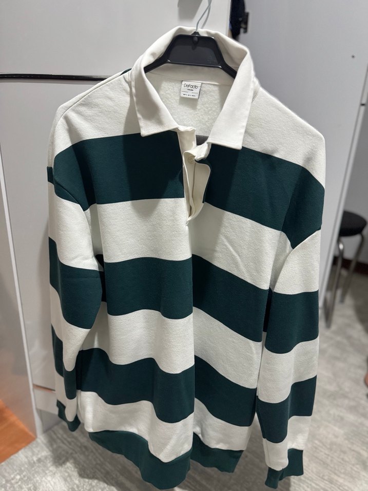 Erkek için uzun kollu, yakalı ve bol kesim triko kazak. Beyaz ve koyu gri geniş çizgilerle, yumuşak örme sentetik kumaştan üretilmiştir.