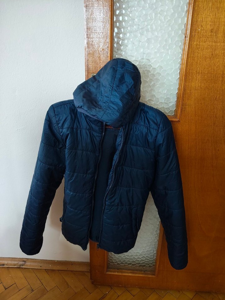 Fermuarlı ve kapüşonlu, koyu mavi, yumuşak kumaştan yapılmış, normal uzunlukta dar kesim kadın kış montu. Uzun kollu ve dış mekan kullanımı için uygundur. ❄️