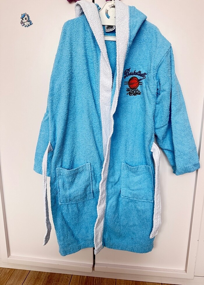 Casilda Home Erkek çocuk mavi renk 10/12 yaş kapüşonlu bornoz.Temiz kullanıldığı için hiçbir sorunu yoktur.İki yanında cep ve belinde kemeri vardır.Omuzdan uzunluğu 81 cm,koltuk altı genişliği 46 cm.#erkekçocuk#bornoz#10/12yaş#mavi#