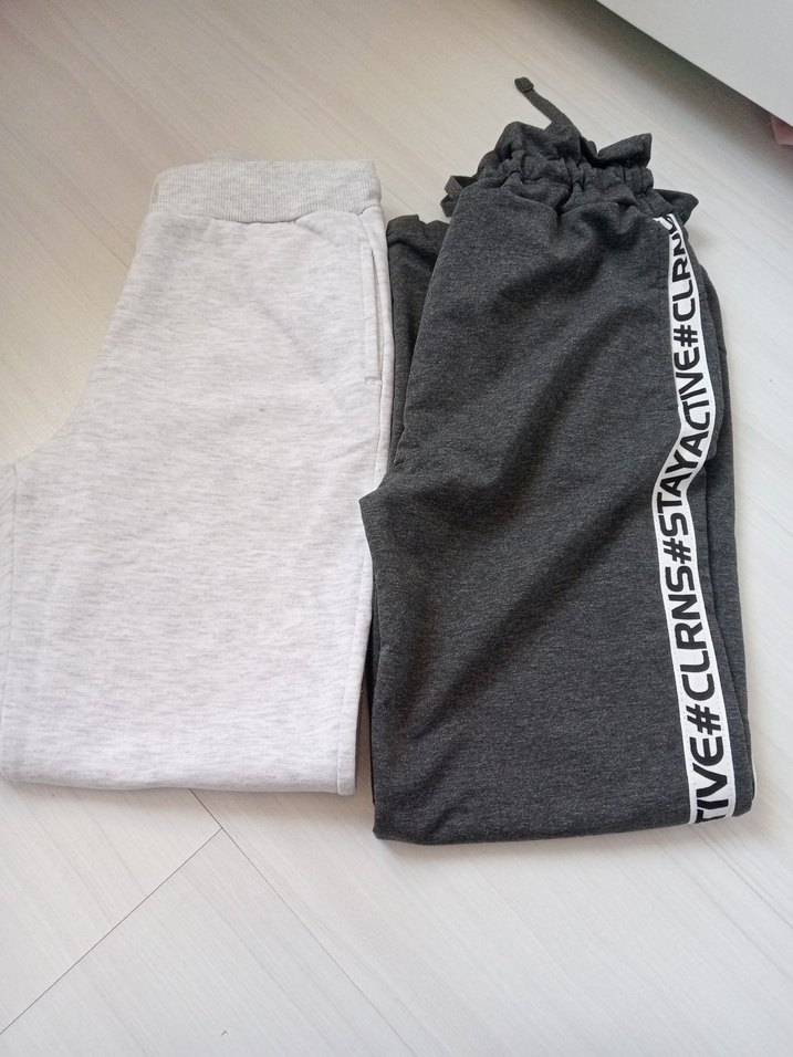 Gri renkli, yumuşak ve sıcak dokulu, bol kesim kadın eşofmanlar. Biri düz, diğeri markalı yan şerit detaylıdır. Günlük kullanım için rahat.temiz sorunsuz gri 9/10 yaş diğeri 11 yaş