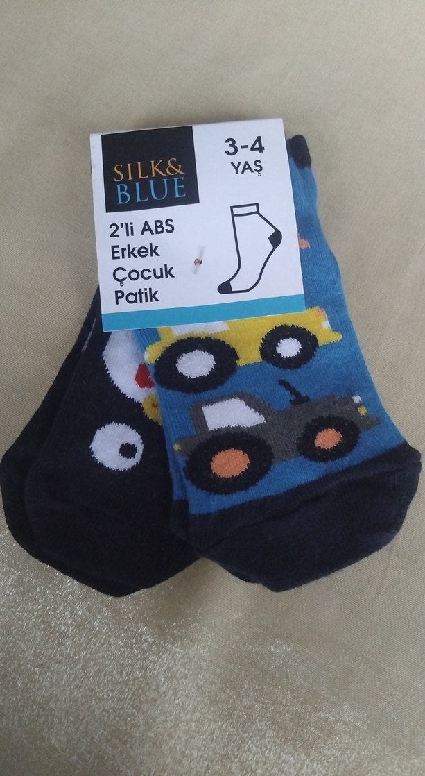 3-4 yaş erkek çocuklar için 2'li koyu mavi baskılı ABS tabanlı patik çoraplar. Araç desenleriyle eğlenceli tasarım.