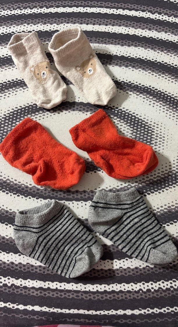 Gri çizgili, kırmızı düz ve bej ayıcık desenli olmak üzere üçlü erkek çocuk çorap seti. Rahat ve yumuşak kumaş.
