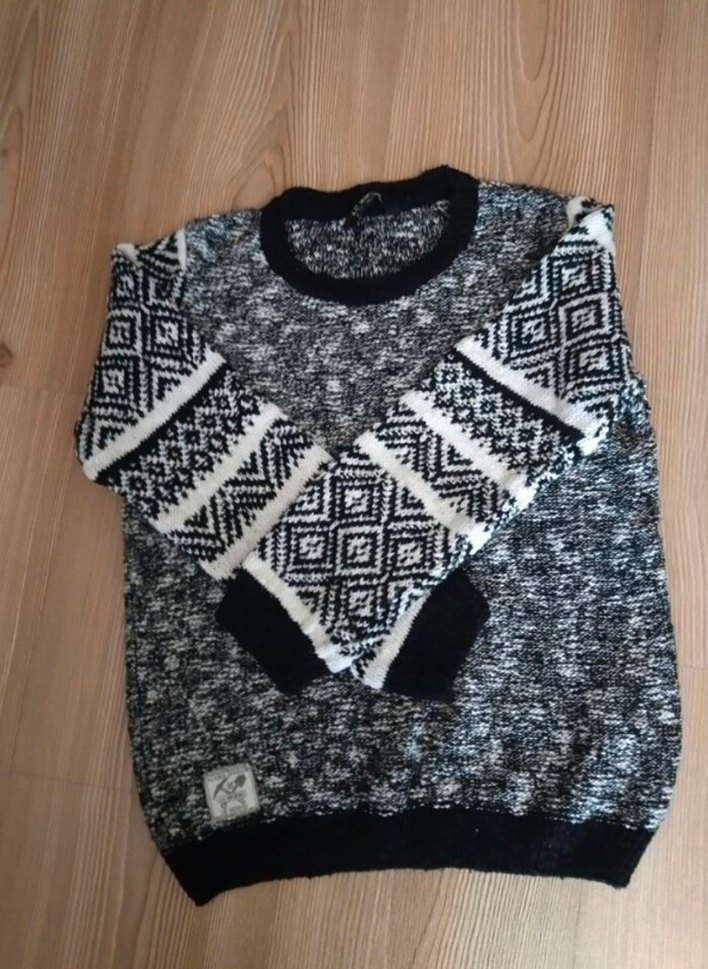 Gri renkli, desenli kollara sahip, yuvarlak yakalı, uzun kollu, bol kesim triko kazak. Rahat ve şık bir sokak stili sunar.