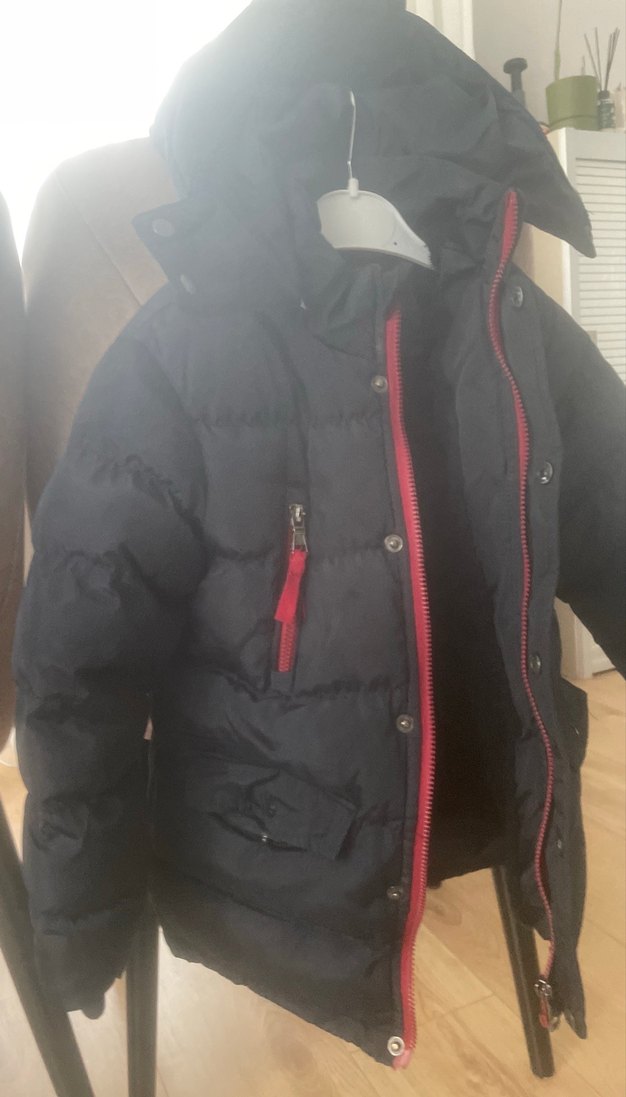 Dik kesim erkek çocuk mont, yakalı ve kırmızı detaylı fermuarlı. Yumuşak, sıcak tutan kumaştan, koyu siyah renkte sokak stili mont. İçi polarlı 5 yaş erkek çocuk yeni gibi duruyor hiçbir kusuru yoktur