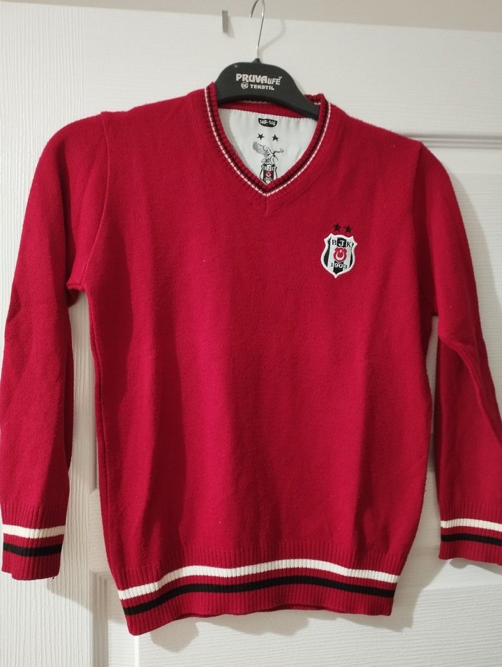 Kırmızı parlak örgü kumaştan erkek çocuk kazak, nakışlı desenlidir. V yaka, uzun kollu ve rahat kesimlidir, trend sokak stili için uygundur.