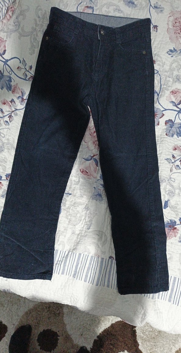 Lacivert renkli kadın denim piliseli bol kesim pantolon. Midi boyda, rahat ve günlük sokak tarzına uygun.Uzun geldiği için kıvrım katı izi var
