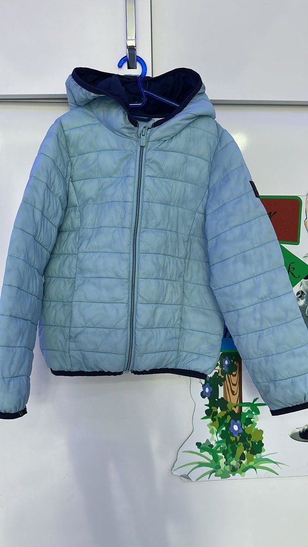 Açık mavi renkli, fermuarlı ve kapüşonlu erkek çocuk montu. Yumuşak ve sıcak kumaştan, dar kesimli, günlük sokak tarzı için uygundur.