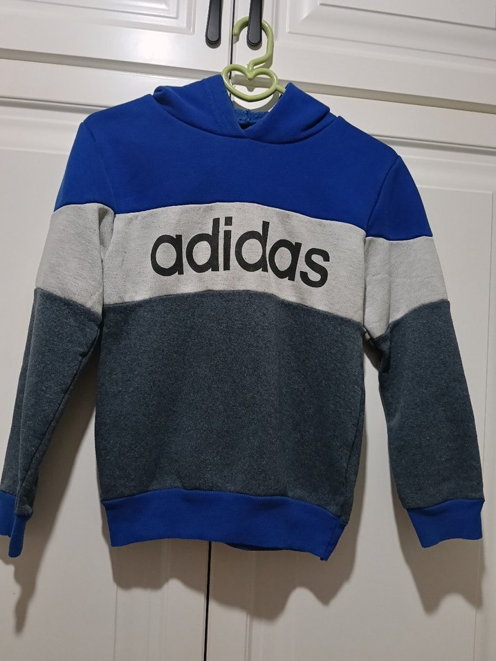 Erkek çocuklar için Adidas kapüşonlu sweatshirt, uzun kollu, bisiklet yaka ve fit kesimlidir. Örme dokusu ve baskılı logo ile mavi, gri tonlarında renk bloklu tasarıma sahiptir. Yumuşak ve sıcak kumaştan üretilmiştir.