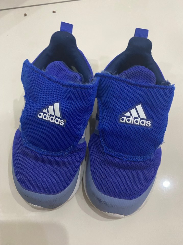 Erkek çocuklar için mavi Adidas spor ayakkabı, cırt cırtlı kapama ve kauçuk tabanlı. Sokak modasına uygun, renkli ve desensiz tasarım.
