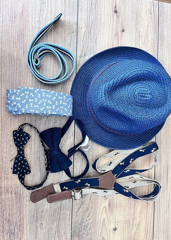 Hasır şapka, kemer, askılı kemer, kravat, papyon