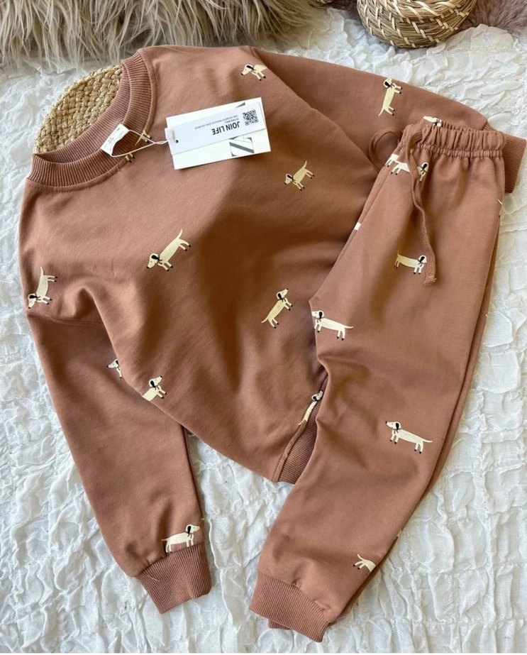 Pastel kahverengi, örgü dokulu ve baskılı sokak stili köpek kıyafeti, küçük köpek figürleriyle süslenmiştir. ince 2 iplik kreşlık sonbahar lık takım 5/6 7/8 kalıpları geniştir bir beden kucuk tercih ediniz