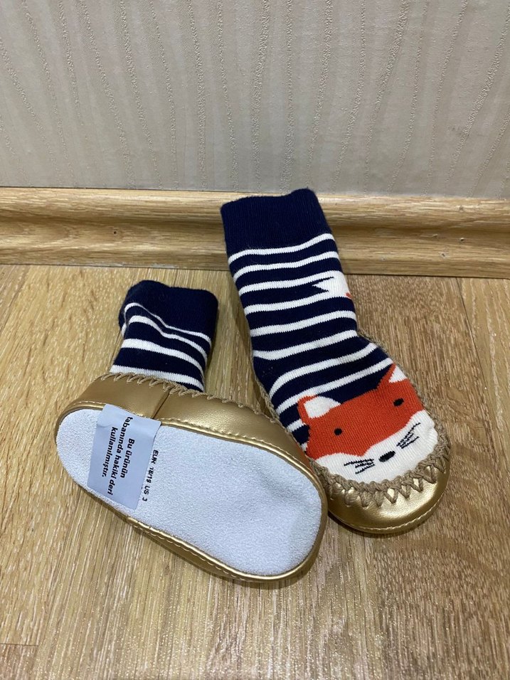 Altın renk tabanlı, çizgili ve tilki baskılı erkek çocuk çorabı. Yumuşak ve rahat kumaştan üretilmiştir. Alti hakiki deridir