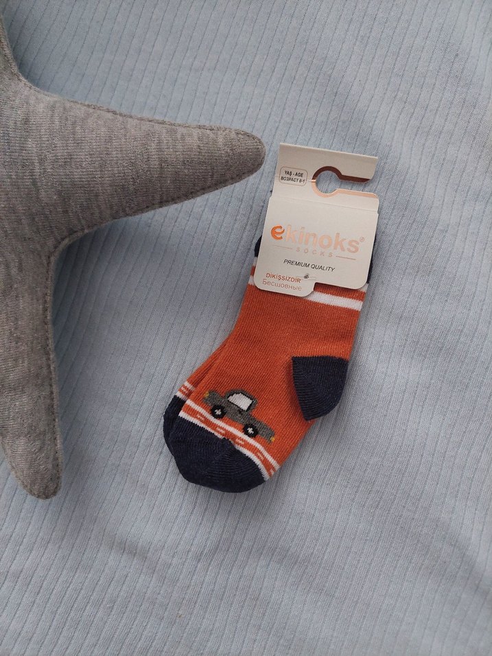Erkek çocuk çorapları, turuncu taban üzerine baskılı araba deseni ve burun ile topuk detaylarına sahiptir. Rahat ve yumuşak dokuludur.