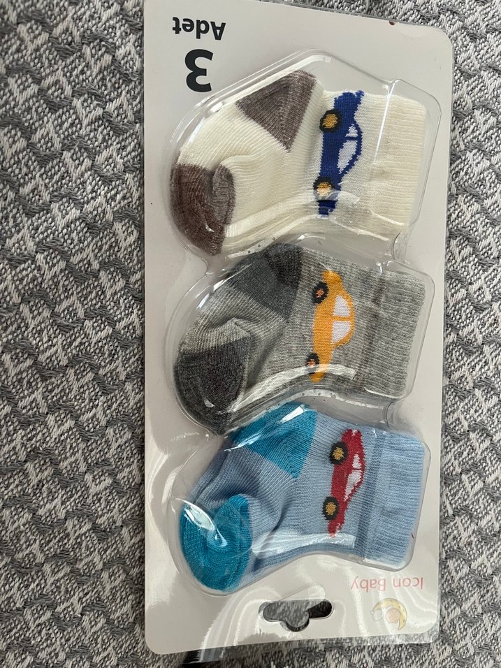 Gri, bej ve mavi tonlarda renkli araba desenli üçlü erkek çocuk çorap seti. Yumuşak ve rahat kumaş.