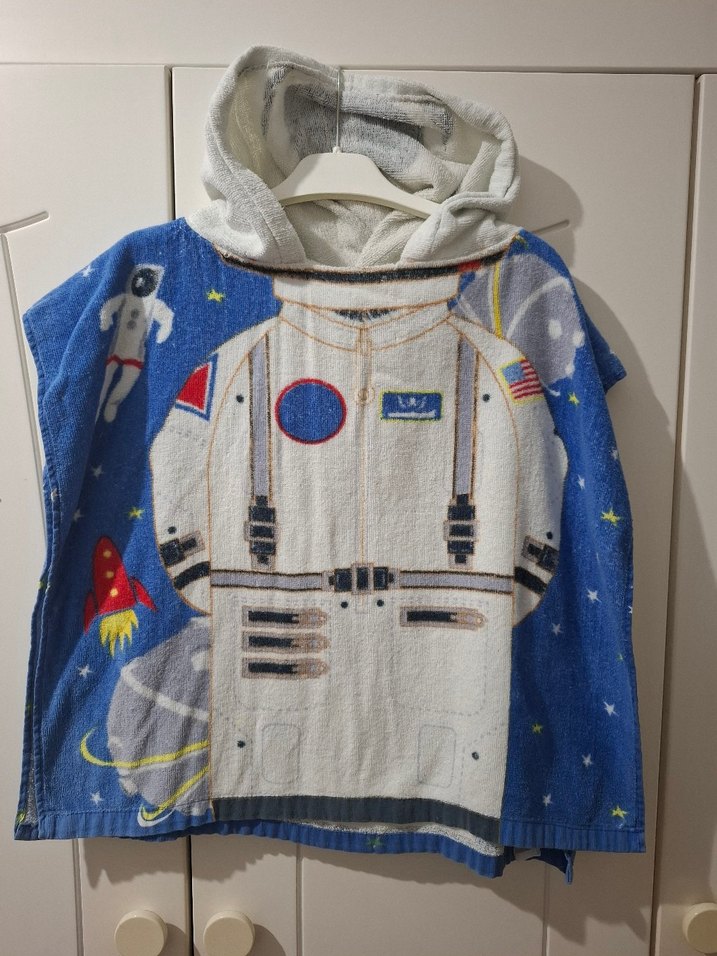 Erkek çocuklar için astronot desenli, kapüşonlu bornoz. Mavi ve gri renklerde, yumuşak ve emici kumaştan üretilmiştir. omuzdan aşağı boy 55cm en 61 cm kullanılmıştır ama sorunu yoktur.3 yaştan itibaren kullanılabilir