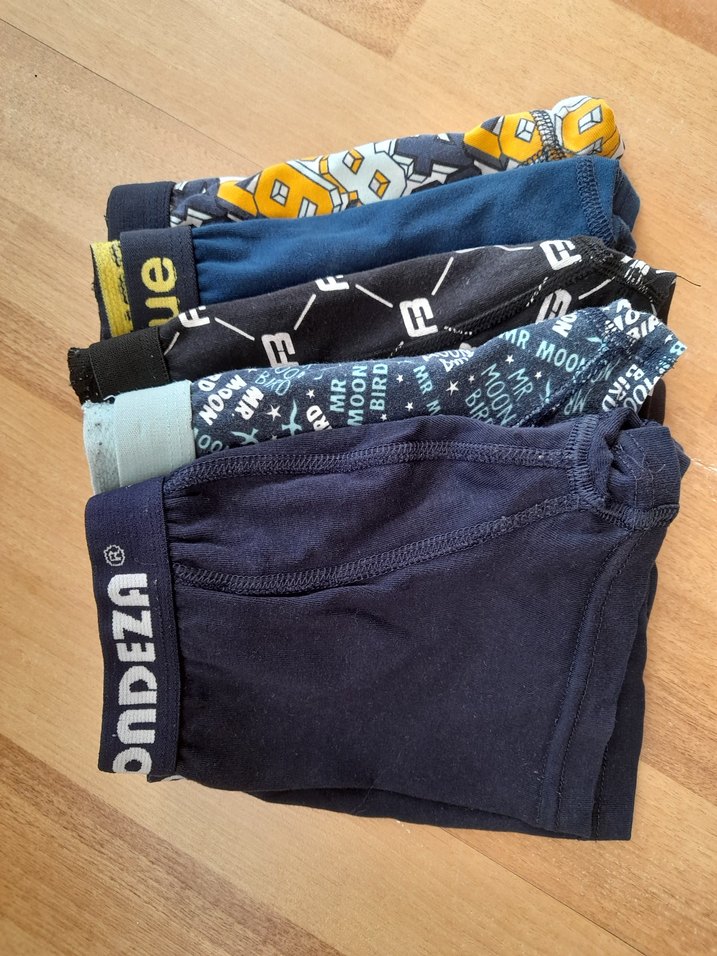 5'li erkek çocuk boxer seti, koyu mavi tonlarında çeşitli baskılı desenlere sahip. Rahat ve elastik bel bantları ile konforlu kullanım sağlar.