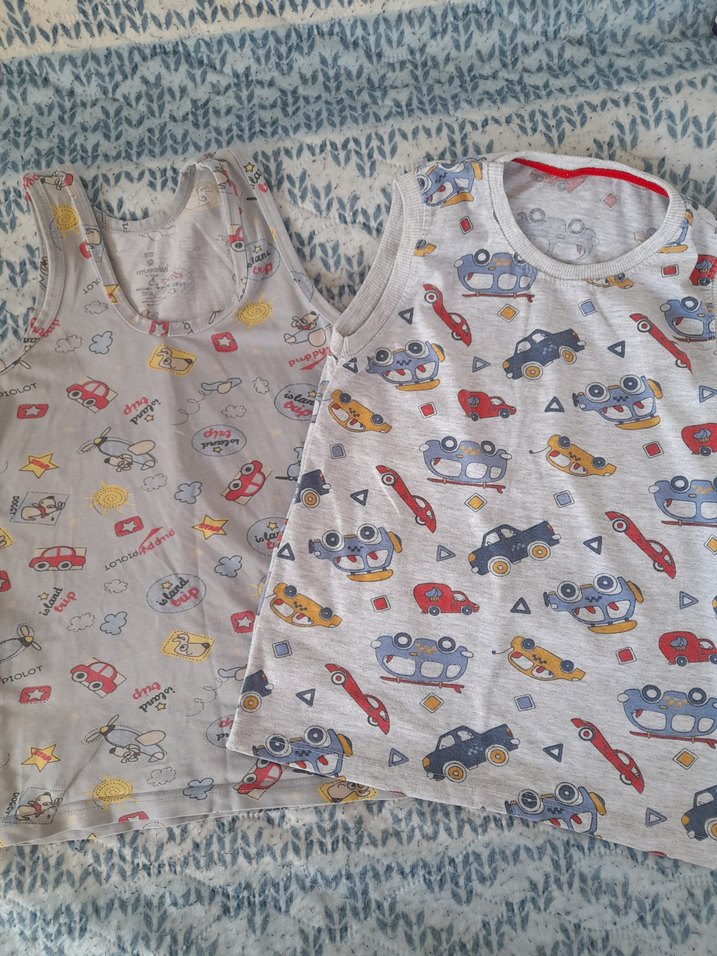 İki adet gri renkli, arabalar ve uçak desenli çocuk atletleri. Yumuşak ve rahat kumaştan üretilmiştir.