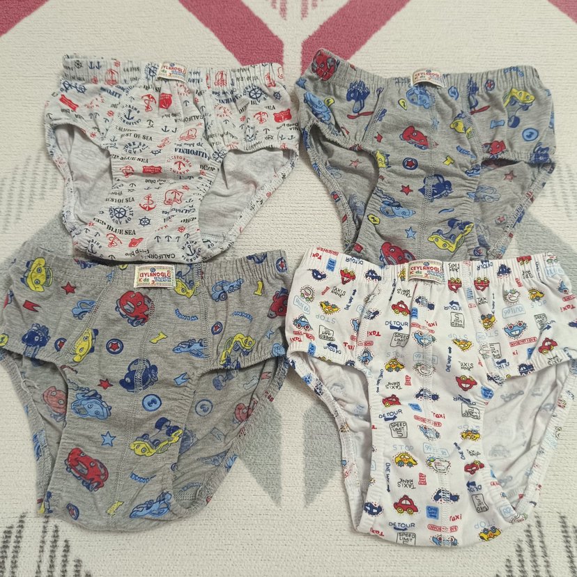 Farklı renkli baskılara sahip dört adet gri ve beyaz erkek çocuk boxeri. Yumuşak kumaştan üretilmiştir, rahat kullanım sağlar.