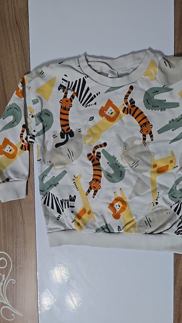 Erkek çocuk için uzun kollu, bisiklet yaka ve bol kesim sweatshirt. Sentetik kumaştan üretilmiş, rengarenk hayvan baskılarıyla sokak modasına uygun.