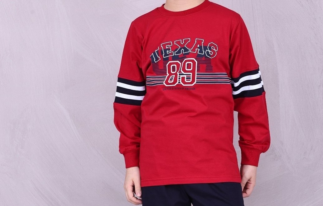 Uzun kollu, bisiklet yaka ve elastik manşetlere sahip kırmızı renkli, bol kesim çocuk sweatshirtü. Üzerinde renkli "TEXAS 89" baskısı bulunur.