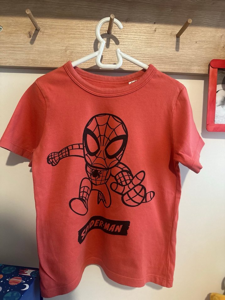 Pamuk kumaştan, renkli baskılı Spider-Man figürlü, dar kesim kırmızı erkek çocuk tişörtü. ️