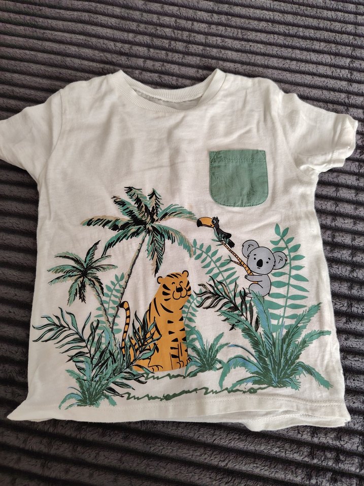 Pamuklu, beyaz renkli erkek çocuk tişörtü, kısa kollu ve yuvarlak yakalıdır. Gevşek kesimi ve orman temalı baskısı ile tarz bir görünüm sunar. Küçük yeşil cepli.