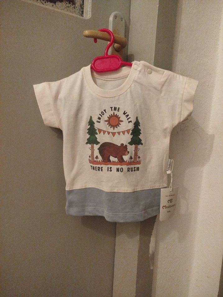 Pamuklu kumaştan, bol kesim, kısa kollu erkek çocuk tişörtü. Ayı ve ağaç baskılı, "There is no rush" yazılı, kahverengi ve gri renklerde.