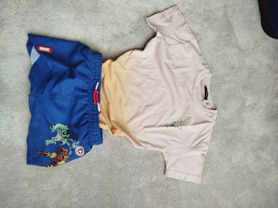 Erkek çocuk için pastel camel renkli baskılı kısa kollu tişört ve elastik bel bağcıklı canlı mavi şort seti. 6 yaş için. Tişört BG, şort ZARA. Hiç bir kusuru yok.