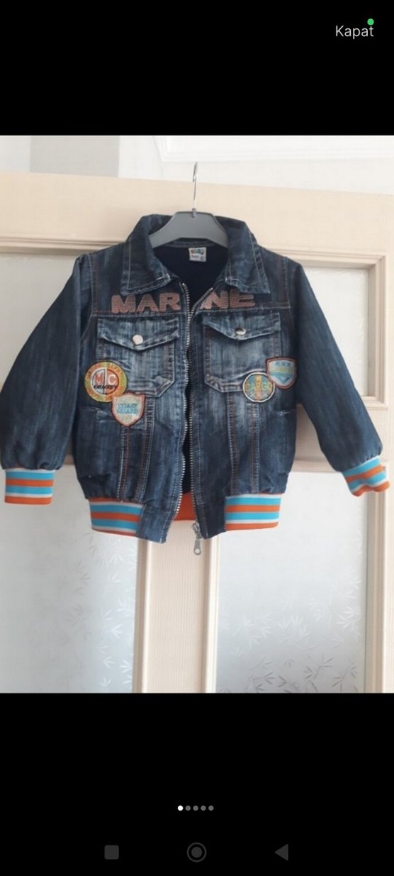 Erkek çocuklar için baskılı kot ceket, geniş kesim ve kırmalı yaka ile düğmeli ön tasarıma sahiptir. Koyu mavi renkte, baskılı rozetler ve çizgili manşetler bulunur. hiçbir yerinde deformasyon yok yeniden farksız sadece 2 ay kullanıldı
