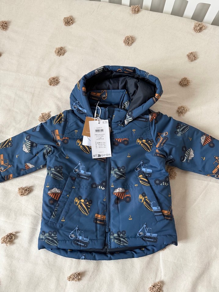 Fermuarlı, baskılı ve koyu mavi renkte, notched lapel yakalı, erkek çocuklar için fit kesim mont. Yumuşak ve sıcak kumaştan, trend sokak stili için uygun.