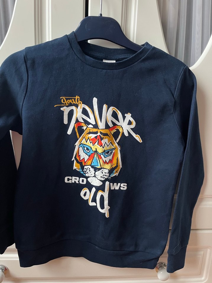 Uzun kollu, bisiklet yaka, erkek çocuk sweatshirtü. Üzerinde rengarenk kaplan baskısı mevcuttur.. Yumuşak ve sıcak kumaştan yapılmıştır. Sadece 1 defa yıkandı. Tertemiz sorunsuz sıfır ayarında.