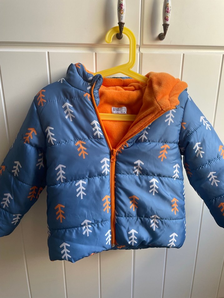 Mavi renkli, baskılı, fermuarlı ve fit kesim erkek çocuk montu. Yumuşak ve sıcak iç astarı ile sokak tarzına uygun bir parça.