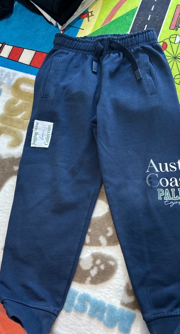 Koyu mavi, baskılı, fermuarlı cep detaylı ve yumuşak kumaştan erkek çocuk jogging altı. Rahat ve bol kesimdir. Sol dizde ufak bir delinme var. ♂️