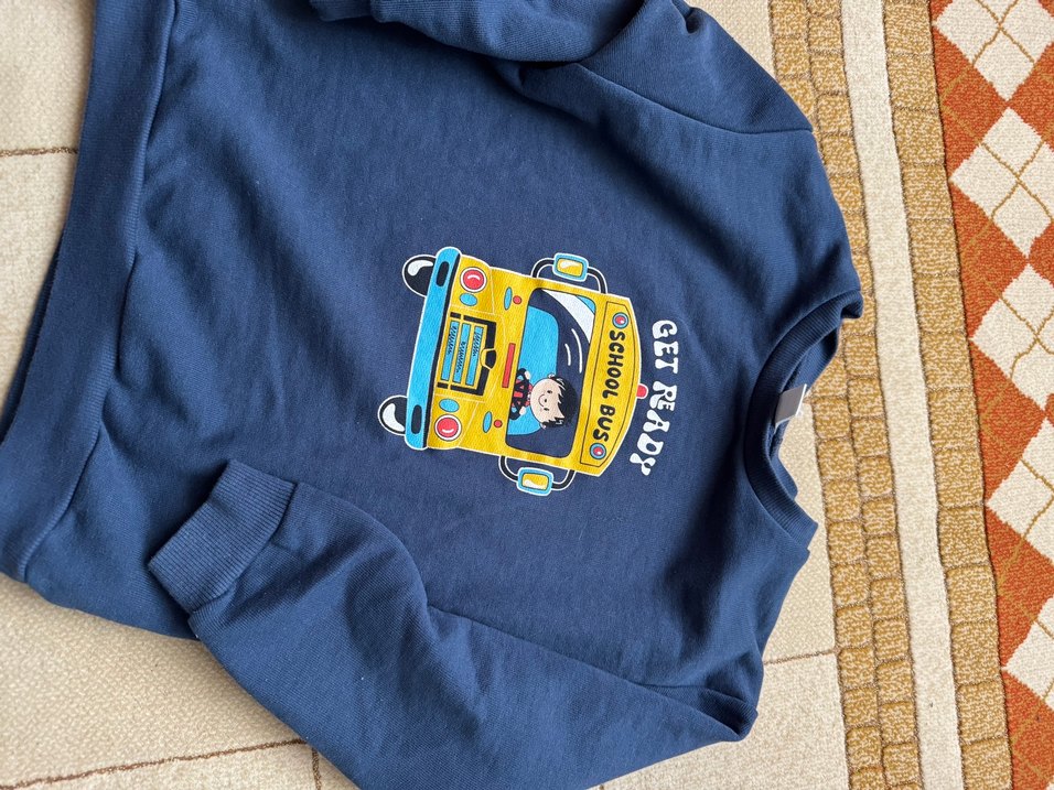 Erkek çocuklar için, önünde renkli okul otobüsü baskısı bulunan sweatshirt. Yuvarlak yaka, uzun kollu ve bol kesimdir, yumuşak ve sıcak kumaştan üretilmiştir.