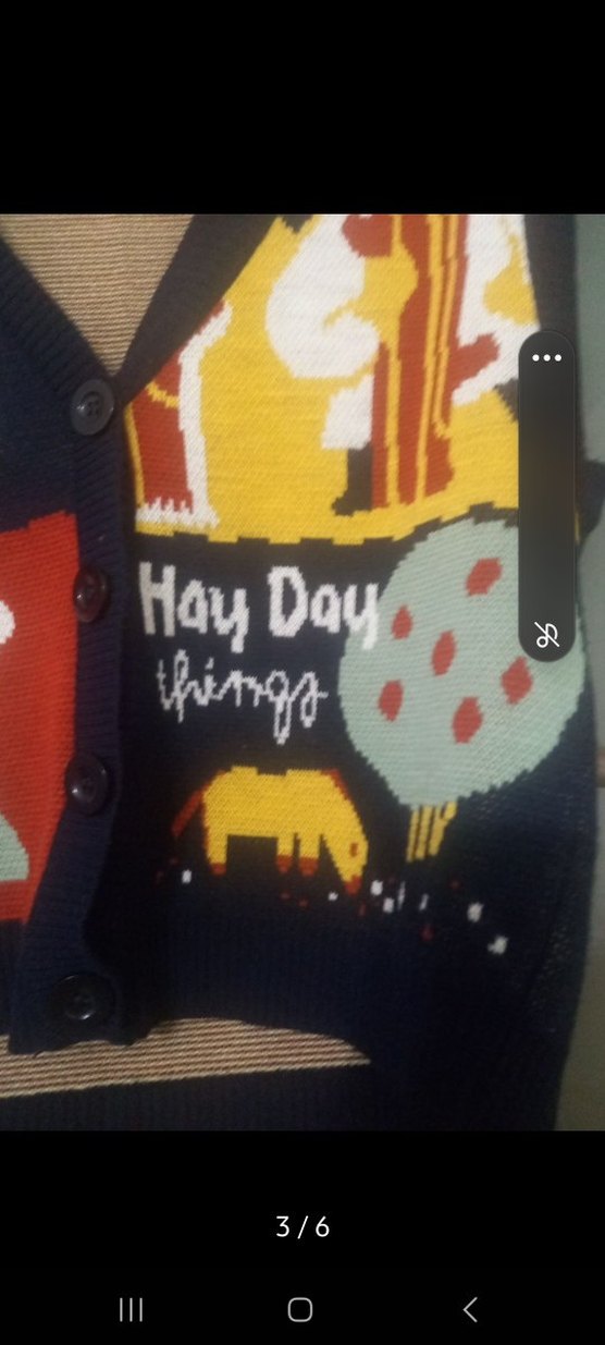 Fitted kesim, yüksek yakalı ve uzun kollu erkek çocuk yeleği. Yumuşak sentetik kumaştan, renkli baskılı örgü pop kültür desenli. "HayDay" yazısı bulunur.