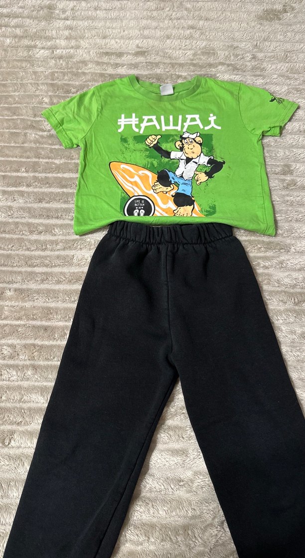 Erkek çocuklar için bol kesim, baskılı yeşil bisiklet yaka sweatshirt ve koyu renk, elastik bel ve cırt cırt detaylı polar eşofman altı takımı. Üstte "HAWAi" yazılı grafik bulunur.