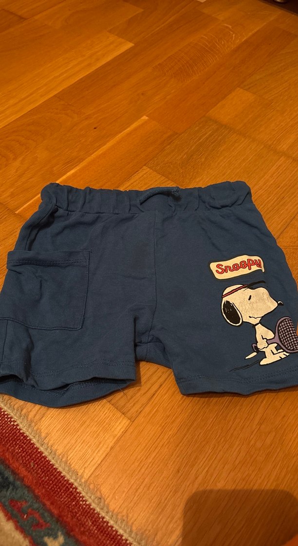 Erkek çocuklar için bol kesim, rahat ve yumuşak kumaştan, baskılı Snoopy desenli koyu renk şort. Sokak stiline uygun.